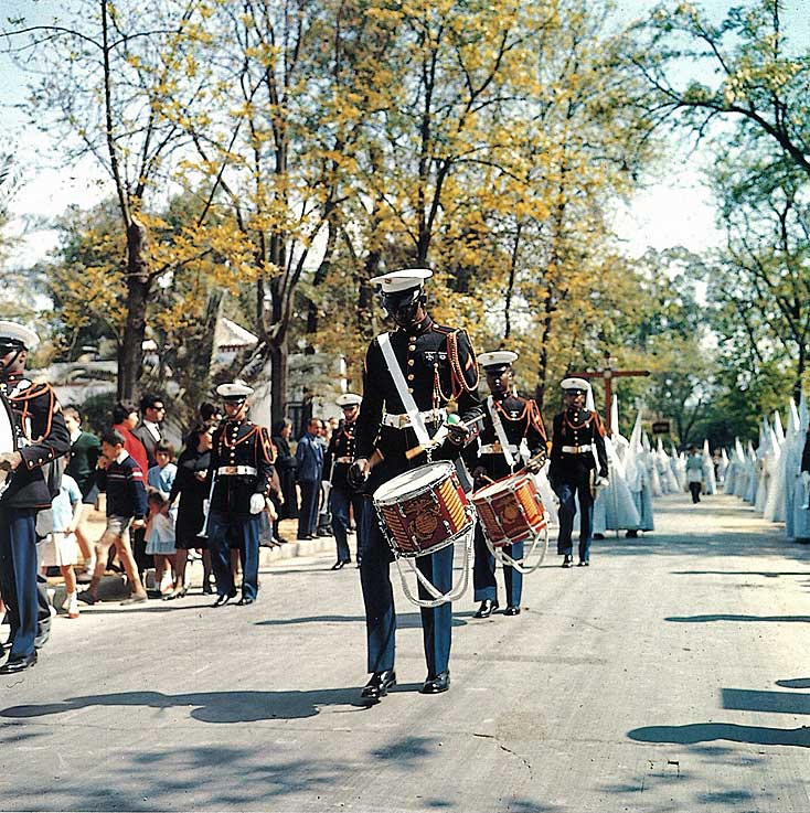 Corría en año 1966 y varios miembros de la junta de gobierno fueron a Rota con la intención de que el Domingo de Ramos la banda de la VI Flota de los EE.UU. tocará desde El Porvenir. Dicho y hecho, aquello sonaba imponente y el trato se cerró.- Pero a pesar de las buenas intenciones de todo el mundo el "experimento" no funcionó desde el primer momento. De entrada, algunos de sus integrantes de color (negro) se pusieron nervioso al ver a uno señores con capirotes y capas blancas, y confundirlos con otros desgraciados que en su tierra gastan indumentaria similiar y con otras intenciones, por lo que hubo que darles un rápido e intensivo curso semanasantero .- Luego tocaron lo que Dios les dio a entender y de la manera que se lo dio a entender, una música en nada apropiada para una cofradía, asi como el ritmo de paso completamenten desajustado al de una Hermandad sevillana en la calle Hasta el punto que cuando llegamos a la Campana el fiscal de Cruz estaba tan desesperado que le suplicó que se callaran, argumentando que de allí en adelante estaba prohibida la música.- La foto habla por si solo "LaPazporelParque" y delante de ellos una banda de marciales marines de los Estados Unidos de Ámerica. Ni los unos , ni los otros se habían visto en otra, ni se volverían a ver .-