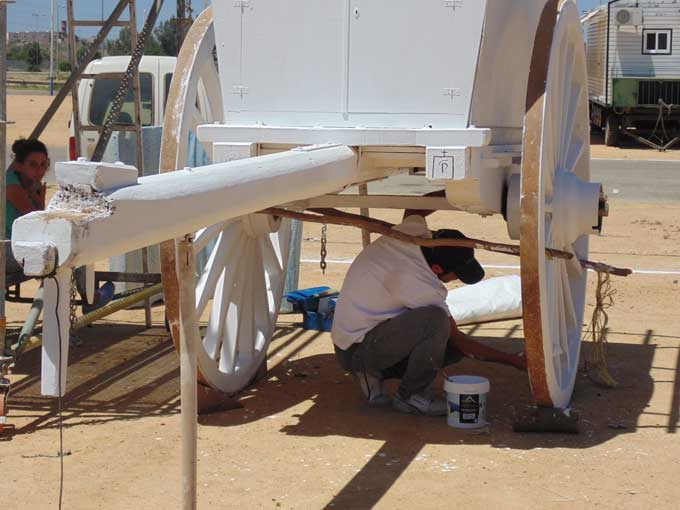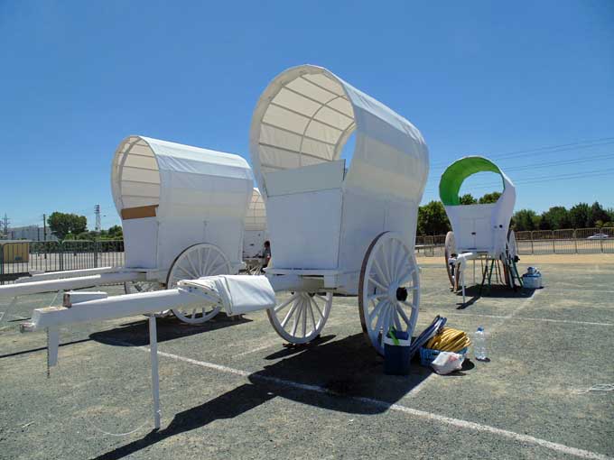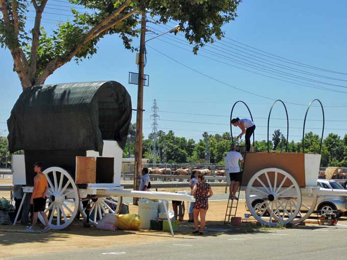 carretas de bueyes emprendiendo camino para la romería del Rocío,