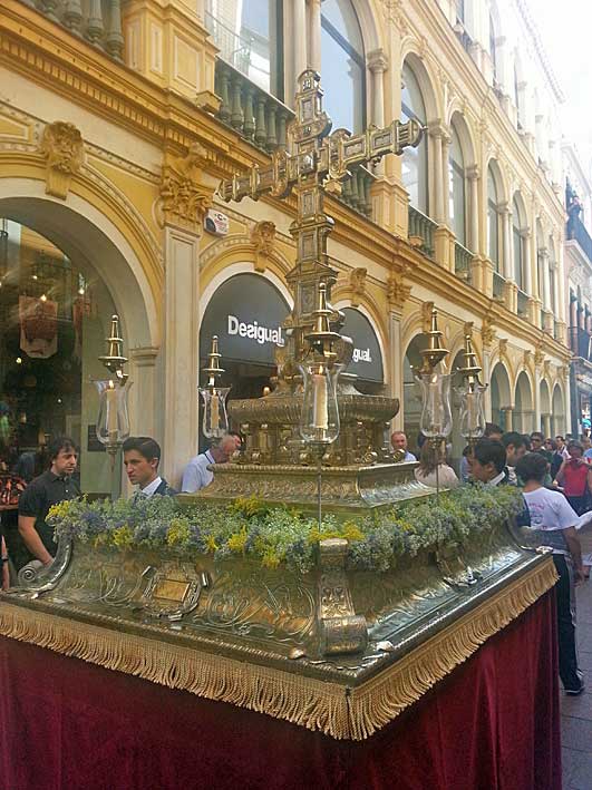 Queridos lectores, desagradables y leales lectores de estas lineas, no se si recordaran , cuando ya hace tiempo les traje aqui , La Cruz de Mayo mas antigua ; pues miren ustedes por donde años mas tarde no la volvemos a encontrara por plena calle Sierpes y donde según nos informa su autor-propietario, es cedida desde hace algún tiempo a la Hermandad del Rocio del Salvador o Sevilla ( o como la quieran llamar ) , para que salgan con ella la sección INFANTIL de sus hermanos .-