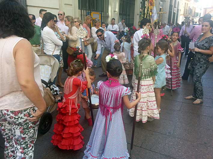 Aqui tenemos como un fundido encadeando temporal de esta chiquilleria vestidas de flamencas ( correcto en una Cruz de Mayo) , acompañando esta procesión infantil propio de la época , con las varitas de la Hdad del Rocio de Sevilla y al fondo las portadas del Corpus ya casi terminadas , de los tiempos y celebraciones que se nos avecinan .-