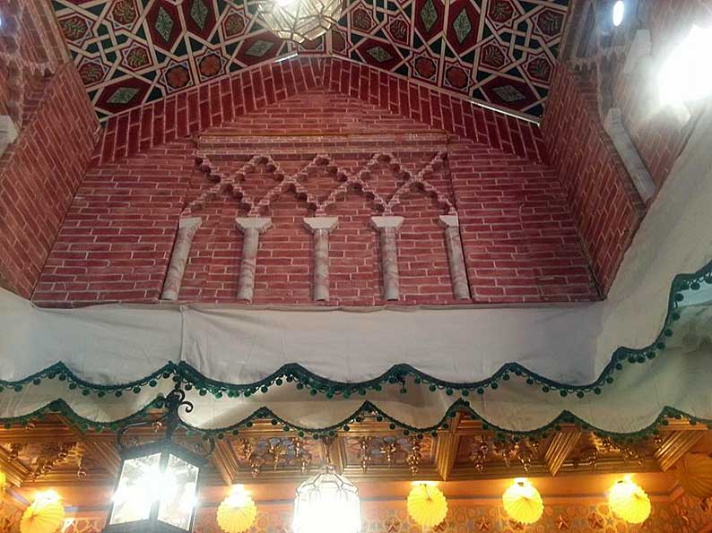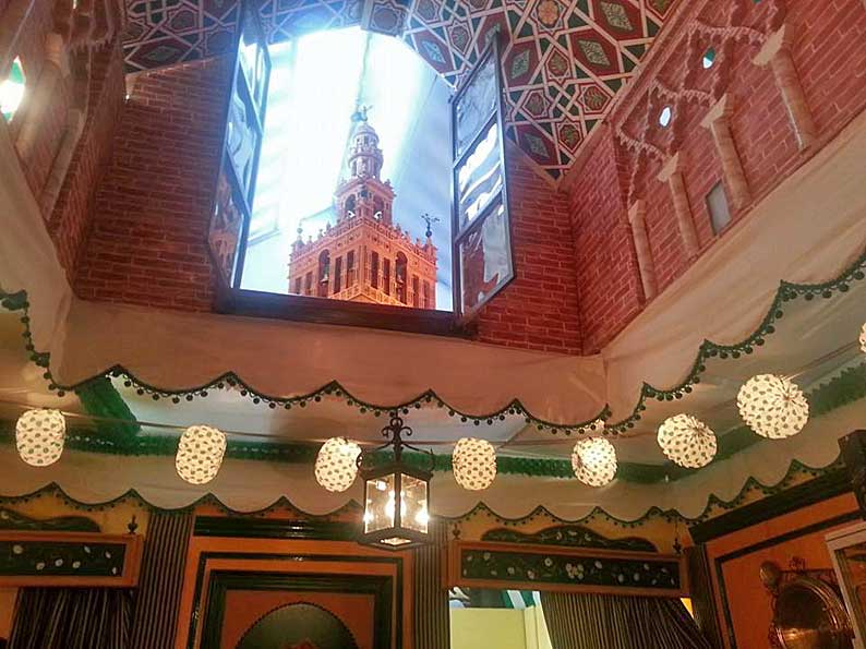 Con una clara inspiración en el Alcazar y la Giralda de Sevilla , tiene mil y un detalles , sobre todo una ventana abierta donde no se puede ver la Giralda, sino se ve una Giralda perfecta. Lo mismo que desde nuestra entrañable Feria del Prado la Giralda y las torres de la Plaza de España se podian ver desde cualquier punto , desde la Feria de los Remedios , no se puede divisar la Giralda por ningún lado ( cosa que olvidan muchos cartelistas ) , y que lo socios y decoradores de esta caseta privada han tenido el buen gusto de subsanar con esta genial idea .-