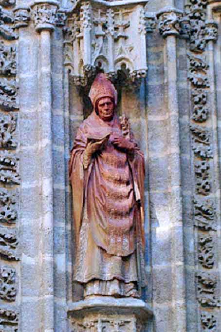 San Leandro en la Puerta del Bautismo de la Catedral hispalense Considerado uno de los Padres de la iglesia y fundador de la escuela teológica de Sevilla, tuvo especial interés en la enseñanza oral y escrita del catolicismo y en la formación de los religiosos. Murió en Sevilla el 13 de Marzo del 599 |