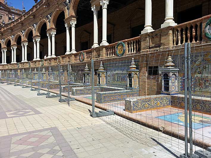 No se puede estar constantamente vallando, parcheando, reparando, las huellas del gamberrismo que lo tienen terriblemente fácil para dañar. Esto es un espacio absolutamente gratuito de Sevilla a todos los que lo visitan, un regalo, un lujo y ha cambio este es el pago que recibe, por lo que deberian de plantearse seriamente tanto su protección, como una mas que justa recaudación , como por otros monumentos sevillanos , para que resulte sostenible ( palabra muy en boga ) y esté como debe de estar, en perfecto estado de revista .; es decir convertila en una Parque Temática Plaza de España .-