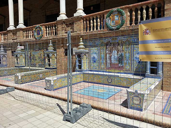 Y ya que estamos en la zona, el otro dia publiqué en mi perfil y muro de redes sociales estas fotos , donde vemos nuestra frágil Plaza de España por enésima vez en restauración . Hace tambien un año, en junio de 2013 denunciabamos en un amplio reportaje en esta pagina ( mal llamada blog ) el lento y progresivo deterioro de nuestra cinematográfica Plaza de España ( VER ) , y lo grave es que los daños que de nuevo se estan ahora reperando, son mayores y mas numerosos que los fotografiados en su dia .- La Plaza de España de Sevilla , ademas de otras muchas cosas es un auténtico museo cerámico al aire libre que esta terriblemente expuesto al salvajismo humano , por lo que no sería una mala formula con todo el paro que hay, dotarla de vigilantes, de guardas, y ya que en Sevilla se cobra azuladamente por todo, cobrar aunque fuera una modesta cantidad a todos los que nos visitan para con dicha recaudación contribuir al mantenimiento, y restauración, de esta repito frágil joya cerámica .-