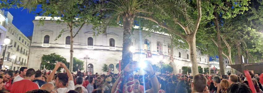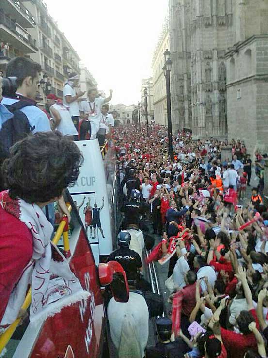 Atestada Avenida de la Constitución rodeando el autobús del Sevilla FC llegando a la Catedral de Sevilla |