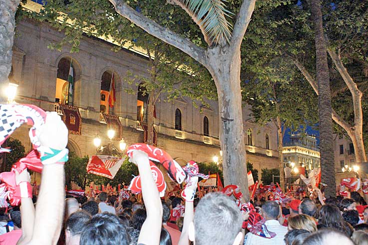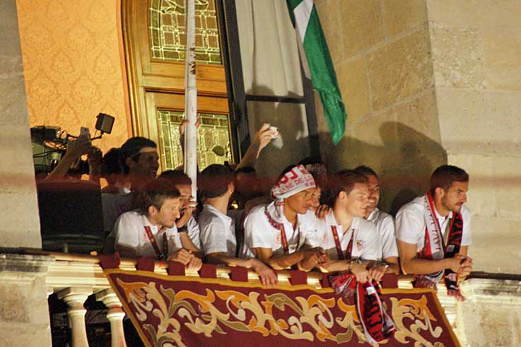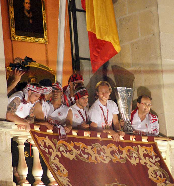 Jugadores y directiva del Sevilla FC junto a nuestro arzobispo monseñor Asenjo, ante la Patrona de Sevilla la Virgen de los Reyes Espectacular aspecto de la Plaza Nueva literalmente tomada por el sevillismo Los jugadores y el presidente del Sevilla FC en los balcones del ayuntamiento de Sevilla con la copa de la UEFA Europa League |