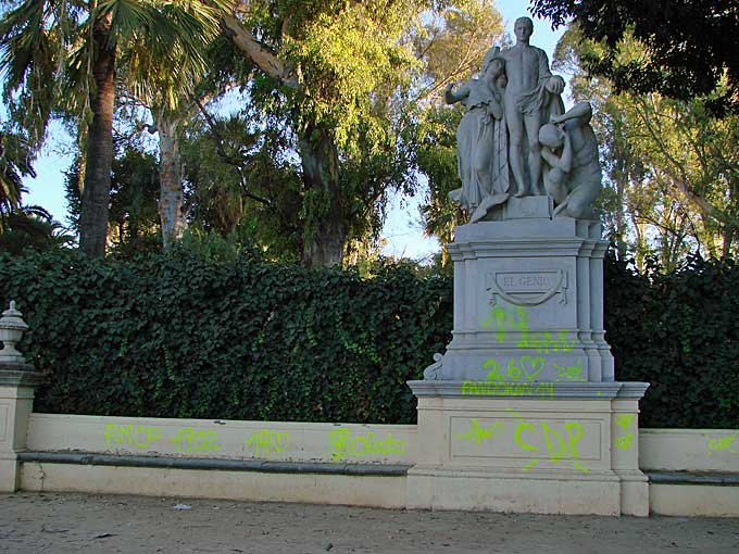 Esta misma semana el alcalde de Sevilla , visitaba oficialmente esta restauración que ha costado la broma de 62.500 euros .Irónia del destino comenzaba sus palabras diciendo : "Vean, comparen y saquen sus propias conclusiones" .Después pasó a escadalizarse de como estaba un arbolito maltratado proximo ( sin darse cuenta que estaba todos iguales) y publicarón un inoportuno twuitt , despues de haber arrasado de arboles Almirante Lobo .- Ayer uno de los grupos escultóricos alegóricos amanecía llena de gamberros en incultos graffitis ( en todo esto no hay absolutamente nada de cultura urbana solo salvajismo ), de amarillo fosforescente, como si quisieran subrayar el "horror vacui" ( miedo al vacio ) a lo limpio, a lo resturado o a lo bien conservado .- Como diría Juaninacio ; "Vean, comparen y saquen sus propias conclusiones", exactamente esto es lo que dura una restauración en Sevilla .- Frente a esta absurdas e