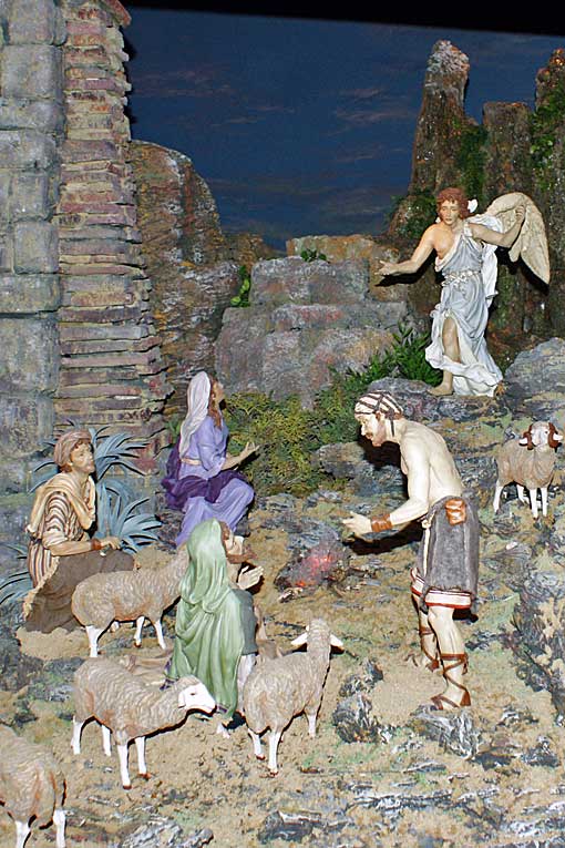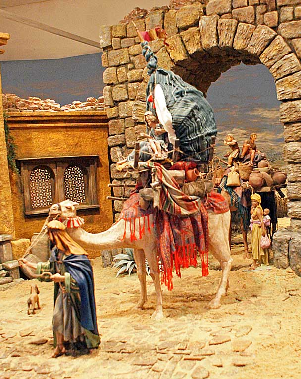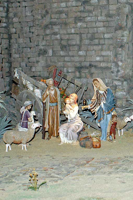 Una curiosdad del Belén de este año es que no tiene portal. El Misterio con San José , la Virgen y el Niños Dios en sus brazos , están en una escena exterior delante de un carro , donde tampoco aparecen la mula y el buey .- |