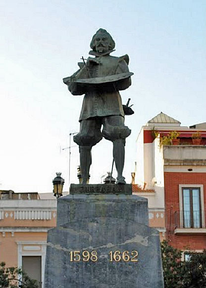 El monumento a Zurbarán, se encuentra en el centro de la plaza de Cervantes, mas conocida como San Andrés, plaza que se constituyó a finales de la centuria de 1800, cuando la iglesia del mismo nombre,tubo que ser derribada debido a su estado de ruina.- La figura está realizada en bronce por Aurelio Cabrera y Gallardo y fue instalada en la plaza el 28 de agosto de 1932, tras ser donada por el autor al Ayuntamiento de Badajoz como agradecimiento por su formación en la Academia Municipal de Dibujo de la ciudad –actual Escuela de Artes y Oficios Adelardo Covarsí- y por iniciativa de los artistas extremeños. Colocada sobre pedestal de mármol realizado por Ángel Zoido, rodeado por un jardín con forma ovalada,dentro tenia un pequeño estanque y una fuente .- La primera y original estatua la realizo con motivo de la Exposición Iberoamericana de Sevilla de 1929, fue encargada por el Ateneo de Sevilla, esta obra estuvo presidiendo la entrada del pabellón de Extremadura, y que los años 50 se situaba en el Parque de María Luisa y después fue trasladada hasta donde se encuentra actualmente, en la Plaza de Pilatos.- La escultura se eleva sobre pedestal trapezoidal en el cual se encuentran esculpidas en sus cuatro caras a Santa Casilda, el escudo de Fuente de Cantos, la Torre del Oro y el Arco de la Macarena. El pedestal de Badajoz, presenta la misma forma que el sevillano pero es completamente liso .- |
