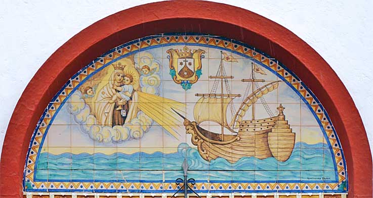 El azulejo no pertenece a la Virgen del Mar , que está en Plaza de Zubaran, en la siempre cerrada Iglesia de la Misericordia , sino a la Virgen del Carmen , donde aparecer con todos los atributos de us iconografía . Como se puede ver , uno de sus símbolos más importantes es el escapulario , símbolo de la protección de la Madre de Dios a sus devotos y un signo de su consagración a María. La Santísima Virgen se lo entregó al General de la Orden del Carmen; San Simón Stock, según la tradición. Otro de sus símbolos es como “Estrella del mar”, que guía a los marineros por las aguas difíciles, donde aparece socorriendo e iluminando un barco en medio del mar, siendo la única representación de estas características tan nauticas que hay de un lienzo cerámico de esta representación .-