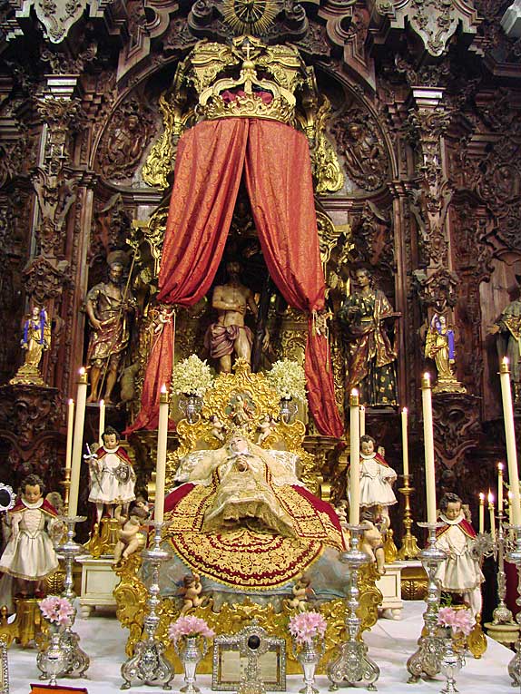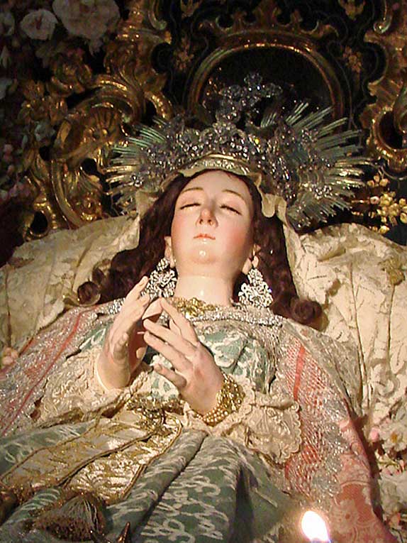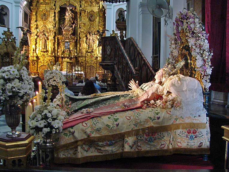 Luego nuestro pasos nos llevarian a la calle Cardenal Spinola , al convento de Santa Rosalia de las monjas clarisas , en cuya iglesia en un entorno único por su colección de retablos, donde se celebraba el Besamanos de la bella imagen de la Dormición de la Virgen , con un exhorno muy personal con profusión de abundantes flores .-