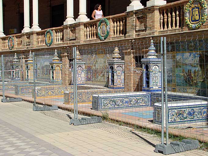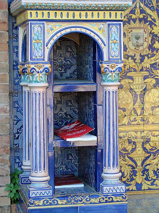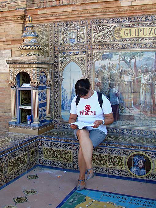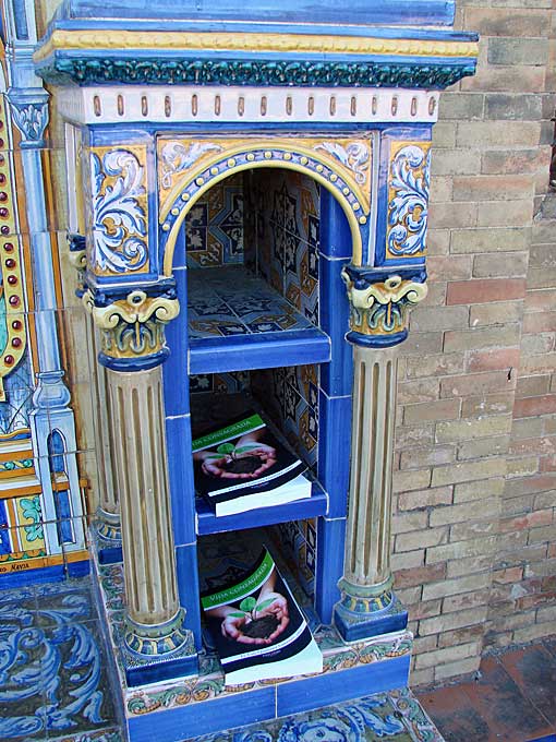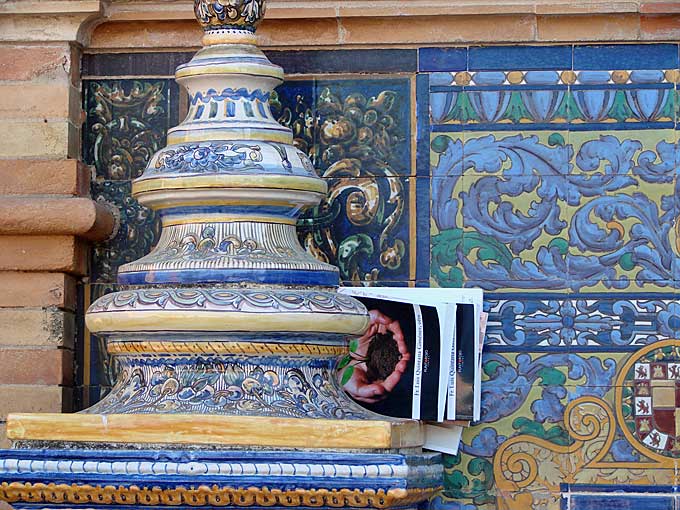 - Se nos olvida, que esto no es Alicia en el pais de las maravillas, es Sevilla . Ayer un servidor que desambula impenitentemente por nuestras calles, plazas y parques, me acerqué a ver este "fenomeno cultural", y palabrita del Niño Jesús de la Sacramental del Sagrario ( que es el bueno) que no llegaba a mas de una docena y mitad del cuarto , lo que alli quedaba de los 1.500 ejemplares que habian dejado, tan solo el día anterior.- En nuestra Plaza de España, lo que hay de verdad son piaras de turistas que son desembarcados en autobuses y pastoreados por voluntariosos guias con mayor o menor conocimiento de la misma, o visitantes en parejas o en familia disparando a todo lo que ven, y si son nacionales afanosamente fotografiandose en los bancos de sus respectivas provincias .- Tambien hay un inmeso y tolerado mercadillo de vendedores de abanicos, souvenirs tipico topicos y música andina, dando a este impresionante monumento, el penoso aspecto de mercadillo de fin de semana, con una vigilancia que sencillamente brilla por su ausencia .-