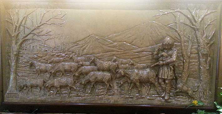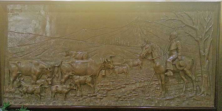 En el restaurante bar La Montanera , quizas este la mayor exposición y colección de grandes altos relieves, de mas de dos metros de ancho, obras de Lemus fechado todos a principio de los años 80 del pasado siglo XX y como pueden ver su temática central son escenas camperas del pastorero del ganado bovino, ovino y cerdos en el engorde de la montanera .-