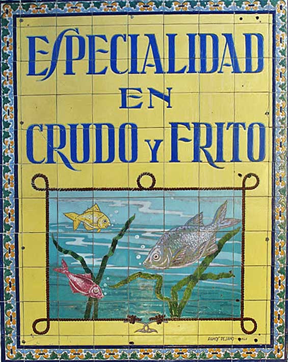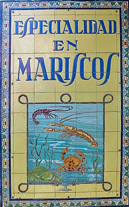 No se si se recordaran ustedes cuando le traje aqui Tele Pescao Frito ( como verán no hya nada nuevo bajo el Sol ) . Pues por aquello que esta semana estamos muy acuáticos y pescaderos, por mor de la inauguración del segundo acuario de Sevilla , hoy regresamos a este mismo lugar esquina José Bejumea y Av de Malaga y concretamente en esta ultima donde podemos ver estos dos impresionante lienzos cerámicos publicitarios , que como pueden observan recuerdan a dos peceras o estanques uno lleno de peces y otros de gambas y cangrejo , pero de azulejo .-