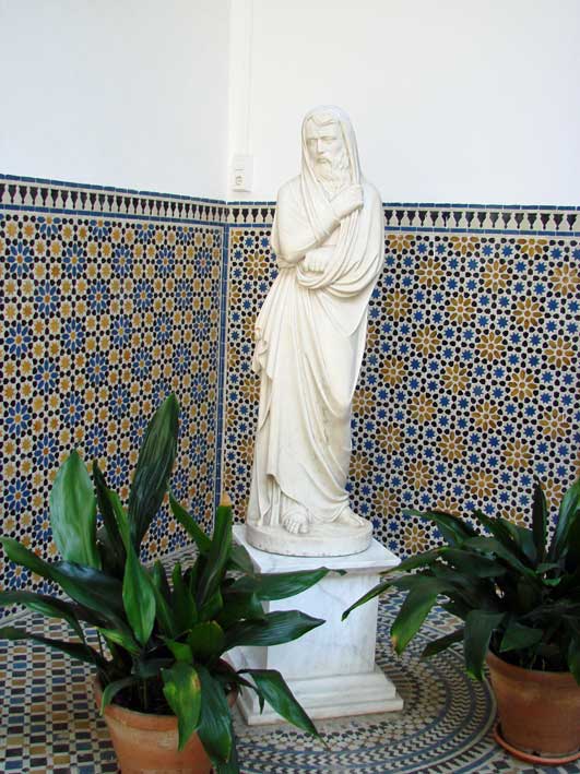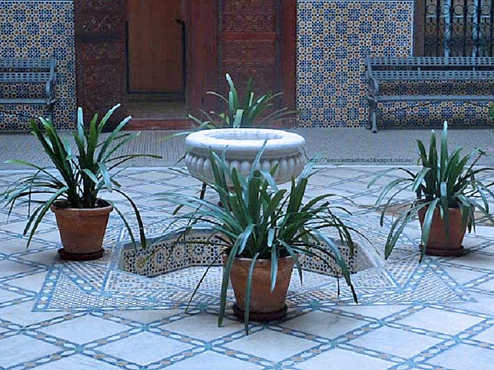 y los suelos, con mosaicos. En el centro con una fuente de mármol