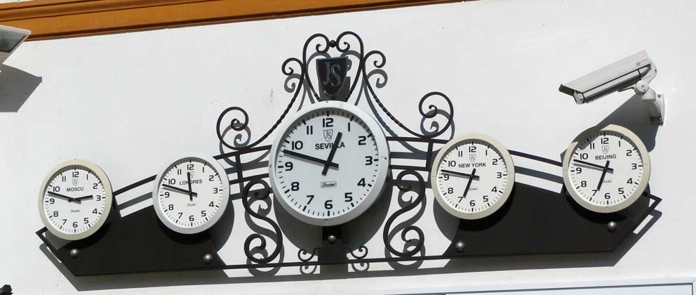 Como pueden ver de su izquierda a su derecha , estos relojes le llevan la contraria al bolero, porque si marcan las horas simultaneamente de Moscú, Londres, Sevilla, Nueva York y Beijing ., con sus correspondientes diferencias horarias .-
