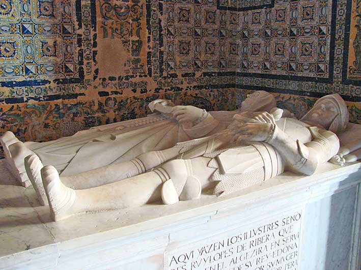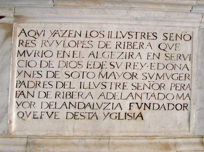 La primera tumbas es de Ruy López de Ribera fue armado caballero por Pedro Ponce de León, Señor de Marchena, durante las ceremonias de coronación de Alfonso XI en Burgos en 1332. Falleció durante el asedio de Algeciras en 1344. Contrajo matrimonio con Inés de Sotomayor, con quien tuvo a Perafán de Ribera, que a la postre sería nombrado I Adelantado de Andalucía .-