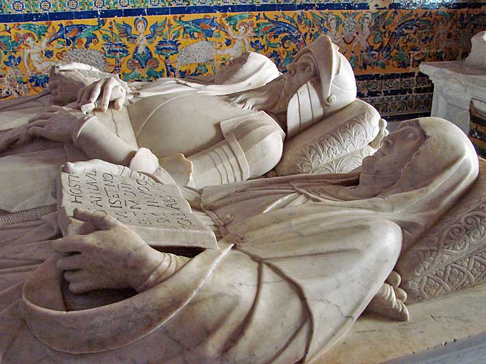 Es curioso, porque esta tumba que se encontraba en la Iglesia fue motivo de conflictos entre el prior cartujo y el ducado de Medinaceli, ya que deberia de estar en la Iglesia, y el prior calificaba de indecencia ver en un templo un hombre acostado entre dos mujeres , considerandolo de "incitante escena"; ( hombre de "mirada sucia" como dirian las modernitas ) por lo que la cambio de lugar si encomedarse a nadie , lo que provocó un enfrentamiento con el poderoso ducado que recurrió al mismisismo rey Felipe V, para que la restituyeran a su sitio, como así ocurrió .-