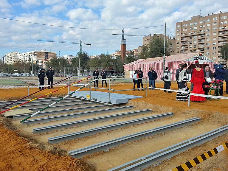 Curiosa imagen de los cimientos de la portada de la Feria de Sevilla que sobre la que se anclarán y levantarán toda una labenríntica estructura de tubos