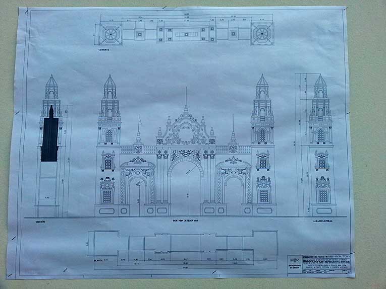 Plano de la portada de la Feria 2015 en su parte central tendrá 30 metro de altura y las torres 45 metros , asi como las famosas 24.000 bombillas