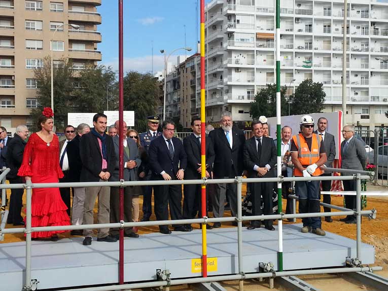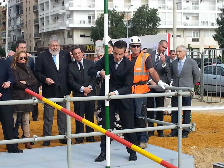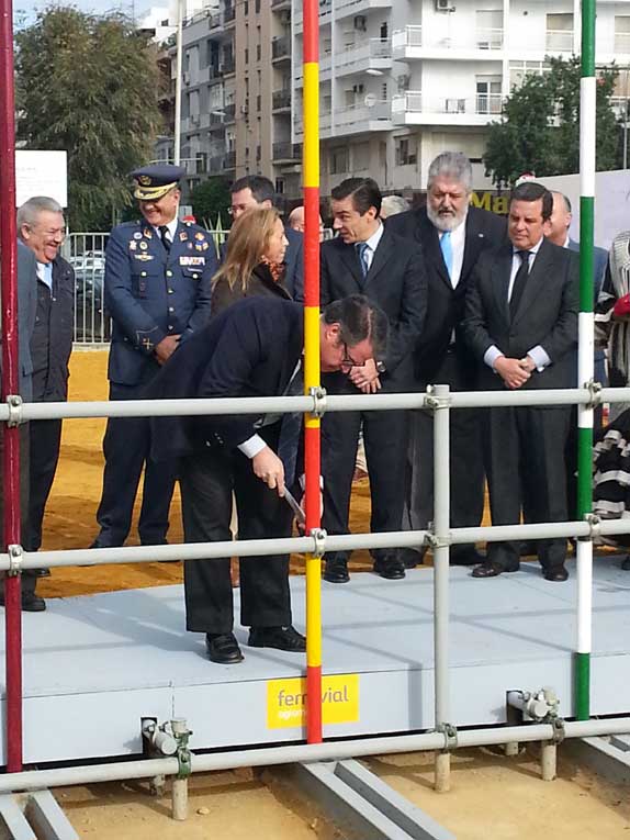 Gregorio Serrado Tte Alcalde de Sevilla colocando otro de los tubos de la portada