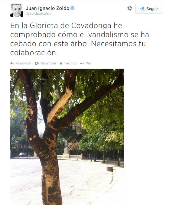 Además de edificios históricos, algunos de ellos cuyo mal trecho estado lo quieren subsanar con pelotitas de baloncestos, cuadros de geniales pintores donde cualquier museo del mundo matarían por exponerlo, le colocan temerariamente en cualquier Iglesia una vela encendida con la mayor naturalidad del mundo; también tenemos un rico patrimonio inmaterial ( termino en su día que acuñó el maestro Burgos ) refiriéndose a nuestras tradiciones, que milagrosamente se mantienen ante un clamoroso desconocimiento de la mayoria del ignorante personal ; así como un tremendo patrimonio humano ( termino que acuñado por un hermano mayor de la Hdad de San Bernardo) , al que algunas inconscientes juntas de gobiernos no duda en maltratar , lanzándolos a la calle , dándoles igual las inclemencias del tiempo, pero no solo del mundo cofradiero, gracias a esta última catalogación perduran los seises, los carrancanos , caballistas en la Feria, etc .- Pero hoy les voy hablar de nuestro Patrimonio Verde. A todo el mundo se le llena la boca hablando de ecología, de naturaleza, se pone las manos en la cabeza cada vez que un torpe y multimillonariamente subvencionado lince matalascañero que tiene mas hambre que el perro de un pastor se sale del parque de Doñana a comer en basureros y los atropella un coche , pero se nos olvida que la ecología como la caridad empeiza por nostros mismos, se nos olvida nuestro patrimonio verde urbano , que además de ser un lujo para la vista y el olfato ( el mundo capillita se le ponen los ojos en blanco con el olor azahar ), es necesario en una ciudad cuyas temperatura en verano puede competir con las de cualquier desierto ( lo de este año ha sido milagroso ) . Sencillamente son necesarias grandes sombras verdes en todas nuestras calles .- Lo ocurrido a finales de Agosto en Almirante Lobo , donde indiscriminadamente se han talado un lujo de inmensos plataneros ( el árbol urbano mas antiguo de Europa) centenarios que estaba en perfecto estado de salud , bastaba ver los troceado troncos de la buena salud que gozaban, digamos que ha sido una chispa detonante del desamparo y abandono es que se encuentra todo nuestro patrimonio verde urbano .- Ayer en Twitter ignoro si el propio Zoido, o su community manager. o jefe de prensa, cometieron por enésima vez , la enésima torpeza de tirarse un enésimo tiro en un píe ( Sr Espada así se lo ponían a Felipe II, ante su "activismo de salón" , con este penoso asunto ) de publicar lo que ven en la vergonzante foto superior, con el lamentable texto: “En la Glorieta de Covadonga he comprobado cómo el vandalismo se ha cebado con este árbol. Necesitamos tu colaboración” . A parte de la humorada, digna de la revista de humor negro La Codorniz, ¿No les da a ustedes vergüenza?. ¿ Hay alguien medianamente responsable en este ayuntamiento y en los que le antecedieron , pues no se nota la mas mínima diferencia, de cuidar nuestra botánica y flora municipal ?. ¿Nos toman por tontos?.- Como nuestro primer edil, pide colaboración, desde esta modestas líneas se la voy a dar, alguien que andan impenitentemente por Sevilla. Mire Excmo Sr Alcalde Presindente de Sevilla , nuestros parque y jardines están en el mayor desamparo y abandono, de vigilancia, de mantenimiento , de suciedad, donde hay como una especie de otoño eterno . El principal enemigo del maltrato vegetal, no solo son los gamberros, sino el propio ayuntamiento de Sevilla, al no cuidar todos los que tienen repito en sus parques y jardines que dan asquito, sino de propina el inmenso y necesario arbolado urbano , que no se poda, que no se riega, que no se abona, dejados a su suerte, en lo que a básico cuidados se refiere .- La única sombra que hay en muchas calles son las hacinadas sombrillas , bajo las cuales hay hacinados veladores, generadores de suciedad, ruido y limitación de movilidad ciudadana, no hay por donde coño ( sin perdón) pasar. En Sevilla hay un agobiante exceso de veladores, y una alarmante carencia de arboles , en zonas terriblemente transitadas, por propios y sobre todos extraños que sucumben bajo nuestro Sol de injusticia.- Ese inmenso patrimonio verde urbano sevillano, no se apeda, no se tala, hay que cuidarlo , hay que mimarlo como nuestras maravillosas zonas ajardinadas, cuidarlas vigilarlas, mantenerlas y replantar inmensos arboles de sombra, no arbolitos decorativos, mas propios de bodas de famosos .- En cuanto la vandalismo no se ceba en los arboles, se ceba en fuentes, estatuas, azulejos , no de una glorieta, sino en todo el Parque de Maria Luisa, Plaza de España, Plaza de América, Jardines de Murillo, Jardines de la Buhaira, Jardines de las Delicias , etc , porque NO HAY VIGILANCIA y lo que se destroza, pasan AÑOS y no se reparan, siendo esa decidia, un perfecto caldo de cultivo para aumentar los daños .- |