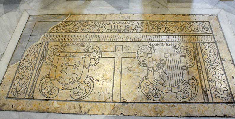 Llegamos a la parroquia de San Andrés ( y si tiene la suerte de encontrarsela abierta ) , exactamente en el centro de la nave central hay esta lápida de importante envergadura donde hay una total ausencia de nombres, de fechas y por contra aparecen dos magnificos escudos nobiliarios unidos por una gran cruz .-