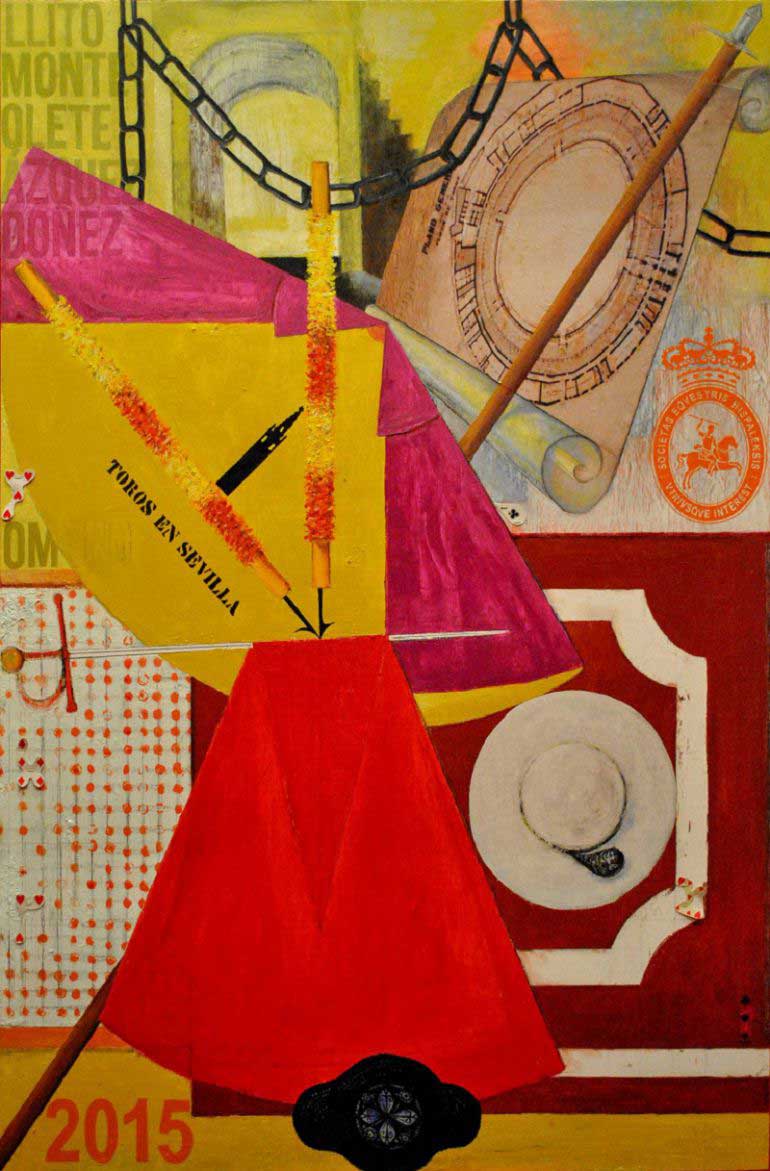 17 de Febrero de 2015 Como hiciera ( o hiciese ) Nuria Barrera en su cartel de la Semana Santa de Sevilla 2013 donde nos plasmó Un bodegón cofradiero , lleno de objetos con una tremenda carga simbólica cofradiera ; el autor del cartel que ven en la foto superior, Juan Fernández Lacomba, nos ha traido un completo bodegón taurino, como cartel de la temporada taurina de la plaza de toros de Sevilla 2015 . Ambos dos carteles por su original temática, adolecen de un pero venial , no haberlos pintado horizontalmente .- Ya que estamos a tiro de piedra de la Cuaresma haciendo un paralelismo semansantero sería la versión taurina de la Cruz de Guia de la Hermandad de los Caballos ( que volverán D.m a ser de Santa Catalina ) o del Gran Poder, donde aparecen todos los simbolos pasionistas .- Capote, muleta, estoque, banderillas, el peto , la puya, la montera , el castoreño, representando los tres tercios, asi como las suerte de todas las corrida de toros .Ya refiriendose Sevilla además de rotular el adverso del capote TOROS EN SEVILLA y encima la Giralda, vemos un inconfundible burladero y albero , asi como el sello maestrante , un plano del ovalado ( que no rendondo coso baratillero ( como diría un cursi ) y la entrada de la Puerta del Principe con sus inconfundibles cadenas .- Respecto al temas de las cadenas , por si no se ha fijado o no saben de que va en 1796. se introduce como novedad en la fachada exterior el uso de unas cadenas sobre la mencionada Puerta del Príncipe. Esta novedad obedeció a un privilegio real (con fecha 26 de febrero de este año), concedido por Carlos IV, por las muchas atenciones y festejos organizados por la Real Corporación con motivo de la visita del meritado monarca a la ciudad de Sevilla.- A su derecha unos entrecortados nombres de toreros LLITO , por Joselito El Gallo o Gallito; MONTE, por Belmonte; OLETE, por Manolete, AZQUEZ; por Pepe Luis y/o/u Manolo Vázquez y DOÑEZ , por Antonio Ordoñez . Mas abajo ligeramente tapado por un capote algo trasnparante OMERO, por Curro Romero, el torero mas restable de la Maestranza, durante décadas y que mas veces colgó el "no hay billetes".- Los profesores de dibujo en los colegios podría hacer una versión el blanco con lineas negras donde sus alumnos los podrían colorear facilmente con vivos y característicos colores cada uno de los simbolos del arte de la tauromaquia .- Lo único que no alcanzo a comprender es el simbolismo de los trozos de naipes de corazones rojos, que aparecen bajo el capote, disimulados en el peto, asi como en el burladero y el uno de treboles negro .Parece como si la suerte de los pasionistas dados,( con los que los legionarios romanso se jugaron la túnica del Señor ) hubiera sido cambiados por la suerte de las cartas, pues la suerte ( buena o mala ) es un factor , que como en cualquier faceta de la vida hay que tener mas que presente . Creo que no se me olvida nada .- Para las mamarrachadas habituales a los que nos tiene acostumbrado en la Maestranza , a mi me gusta el cuadro por su original temática, su tratamiento, asi como sus colores muy propios de nuestra fiesta nacional ( por eso a los catetos politicos separatitas catalanes no le gustan los toros ).- |