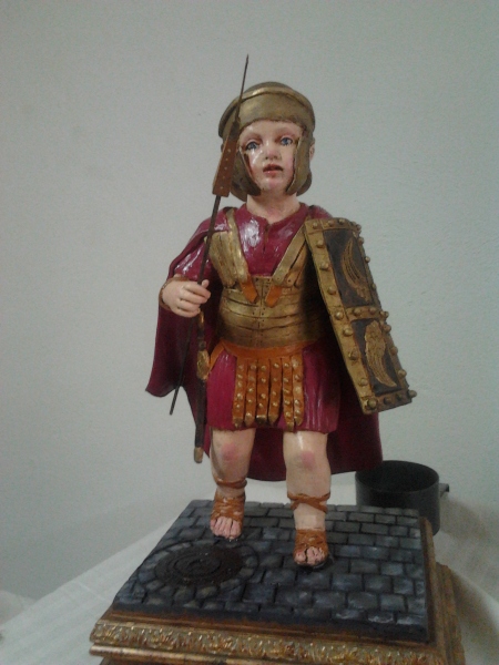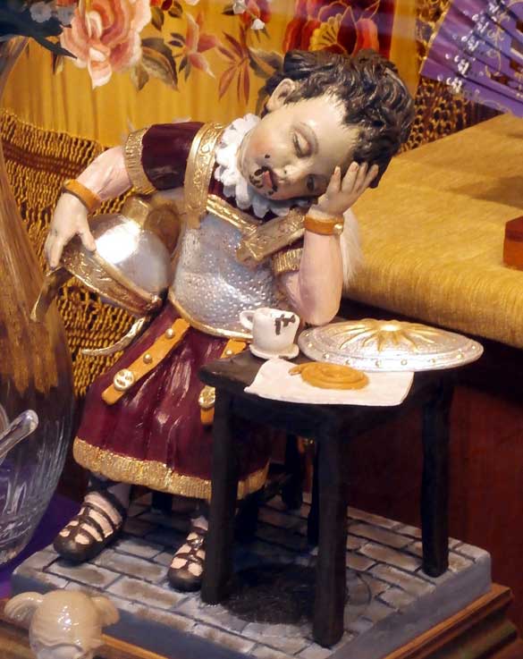 13 de Marzo de 2015 La foto que ven me la ha enviado , Don Francisco Sigüenza Mateos, como tnatas otras que ha tenido a bien enviamre de sus paseos y observaciones por Sevilla . En estos dias de Cuaresmas, hay muhcos comercio que tiene con mayor o pero acierto exhornar sus escaparates con temas de la Semana Santa de Sevilla .- Como me informa el sr Sigüenza , esta en un escaparate de la calle Tetuán , este peqeño armao de la Macarena, sentado y dormido reventando de haber estado toda la Madrugada acompañando ala Madre de Dios , y tras desayunar una rueda de calentitos y una buena taza de chocolate con la boca llena de churretes , el pobre se ha quedado frito, sentado en un taburete apoyado en una mesa sobre un característico suelo de adoquines, hasta con una placa de registro de alcantarillado . Es un poco la representación escultoria del genial articulo de maestro Antonio Burgos : Calentitos de plata .- Como tantas fotos propias de estas fechas, la he publicado en mi perfil de las redes sociales de Facebook , Twitter y Google Plus , y el efecto de la misma ha sido tremendo . Por otro como dice el bolero, se me olvida, que algunas cosas que publico en redes sociales, no la publico en la presente página ( que muchos se siguen empeñando en llamar blog ) , por lo que paso a subsanarlo y de paso a documentarla .- Es obra del imaginero José Antonio Bravo en la calle Antonio Susillo que se ha especializado no solo en Niños Jesús, sino en una original visión infantil pasionista a saber, niños de armao de la Macarena, costalero , romano del Santo Entierro etc. Son niños de terracota policromados . El imaginero nació en 1960 en un corral de vecinos próximo al corralón del Agua, aprendiendo el oficio con su padre, carpintero cordobés .- Como hay muchas personas que han puesto en las redes sociales que desearina tener uno de estos en su casa , sería tan fácil como encargarselo, y según he visto son bastante razonables de precio .-