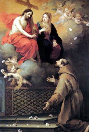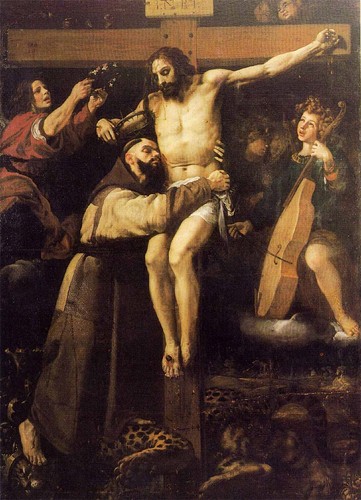 "La Visión de San Francisco en el Porciúncula " Murillo La obra es de una calidad pictórica sin paliativos, PERO hay abismales distancia con una inmortal obra de arte con la que se quiere comparar que y/o/u ha sido al parecer inspiración en el cuadro TITULADO : "San Francisco abrazando a Cristo crucificado" de 1668 que está en nuestro Museo de Bellas Artes ( quizás algunos se han confundido de título con "La visión de San Francisco en la Porciúncula" de Murillo que esta en el Prado ), y el señor Berzoza tiene que ir durante muchos años a Polvillo a comprar el pan para acercarse de lejos a Murillo, e incluso del precendete iconográfico, el menos conocido oleo "San Francisco abrazando al crucificado" del pintor Francisco Ribalta de 1620, un pintor que le gustaba mucho los abrazos místicos de Cristo con los santos ; eso es una cosa , y otra un nazareno/a que no es precisamente un santo franciscano, en plan "me alegro en verte" con el Cristo del Amor .-