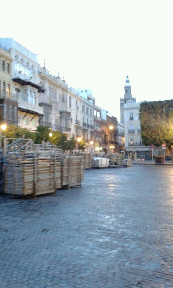 Para que hagan una comparativa , con lo que aqui gusta una arquitectura efímera, esta foto fue tomada en las primeras horas de la mañana del pasado 25 de Febrero, donde se ve la estructura de los palcos descargada de los camiones en la Plaza San Francisco .- |