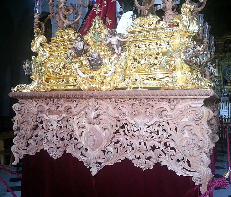 Como recordarán ( o no ) en la Semana Santa de 2012 se estrena un nuevo paso con unas dimensiones de 5,40 metros de largo por 2,60 de ancho, que sale ese año totalmente terminado de talla . Este nuevo paso de misterio se realizó por los hermanos Caballero . De estilo neobarroco, la arquitectura y las formas de este paso están basadas en el diseño del anterior, variando las cartelas realizadas por el escultor Mariano Sánchez del Pino .- Como pueden observar en la parte superior del canasto estaba totalmente dorada y solo los respiraderos seguian en madera sin dorar , y como un servidor entre otro muchos tontos, es el tonto del fíjate ( como siempre le digo en Semana Santa hay que mirar mas que un borrico atado a una tapia ) , me encontre con esto que ven en la foto siguinete :
