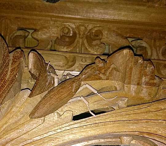 Efectivamente es una mantis religiosa tallada en madera, que parece pasearse por las tallas de los respiraderos de este paso . Los hermanos Caballero, son muy dado a incluir en sus trabajos insectos , como el caso de la avispa en el paso de Misterio del Beso de Judas de la Hdad del Rocío de Sevilla ( VER ) .- Pues ya tienen otra pregunta para los Cesta y Punto o mas modernos Trivial Kofradieros : ¿ En que paso de Sevilla se puede ver una mantis religiosa ? .-