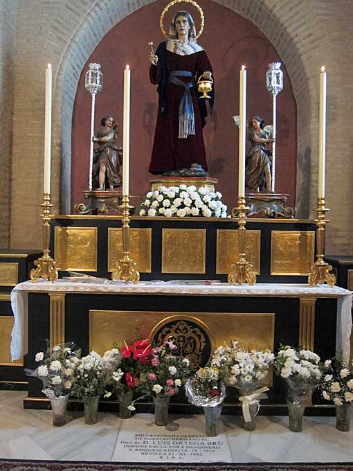 Este es el caso de la tumba de Ortega Brú , está en el anteriomente mencionado templo de San Andrés de Sevilla, concretamente en la capilla de los Sagrados Titulares de la Hermandad de Santa Marta , cuyo genial misterio salió de su genial gubia . ( excepción hecha de la Virgen de las Penas y Santa Marta que son de Sebastian Santos ) , por ese motivo no lo pude publicar en Noviembre pasado, pudiendo fotografiarla después, y al tratarse de un escultor muy presente en nuestra Semana Santa ( La Cena, Santa Marta, San Gonzalo, La Bofeta , El Baratillo y la Macarena - VER - ) he estimado oportuno incluirla en este tiempo de Cuaresma .-