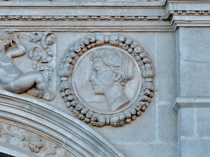 A caballo ( y nunca mejor dicho por la Feria) entre la leyenda urbana y la realidad , a raiz de la visita en la glamurosa Feria de 1966 que a Sevilla hizo Grace Kelly, que por aquellas fechas que ya era la princesa de Gracia Patricia de Mónaco : LOS PRINCIPES DE MÓNACO EN LA FERIA y LA FERIA DE JACKIE KENNEDY ; miren ustedes por donde coincidió con el tallado de una parte de la fachada de nuestra casa consistorial a cargo del escultor Manuel Echegoyán, ( Monumento a los costaleros ) que al parecer quedó tan impactado con la indiscutible belleza del perfil de la actriz de Hollywood y princesa monagesca que la quizo inmortaliza en la obra escultoria que llevaba entre manos, y así por lo visto lo hizo en uno de sus medallones mas correctamente tondos . Ver foto superior .-