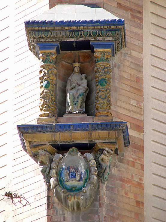 Sevilla en algunos de sus edificios , como le he traido en otras ocasiones a esta página, hay pequeñas y curiosas esculturas de Vírgenes devocionales .-