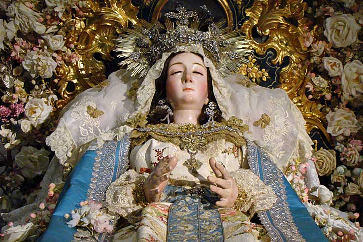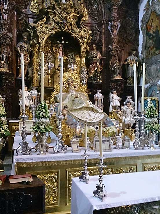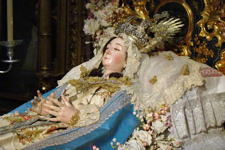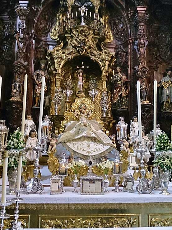 En la calle Cardenal Spinola , al convento de Santa Rosalia de las monjas clarisas , en cuya iglesia en un entorno único por su colección de retablos, donde vemos un año mas la bella imagen de la Dormición de la Virgen , donde le han rendido un triduo en las visperas de la festividad de la Asunción con un exhorno muy personal con profusión de abundantes flores realizadas por las propias monjas .-