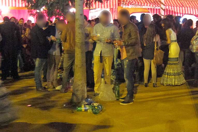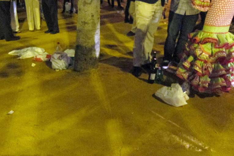 Por cierto , la Podemos juntera , que ayer emuló a su compañera de partido que metio la pata hasta la señalita de la vacuna con la Semana Santa , ayer no quizo ser menos, y dió el cante en la Feria, con unas sevillanas protesta. Debería de tomar buena nota de como vestirse de flamenca, de propina dar unas clases de sevillanas, ( lo de ayer fue un numerito propio de guiri bajo la portada ) pero por encima de todo, que al dia de hoy hay mucho otros foros donde ejercer una reivindicación , y no dentro del recinto de una de nuestras fiesta populares de mayor proyección tanto nacional como internacional . Hace buen tiempo y en vez de montar estos numeritos, esta buena señora se podría ir ... a la playa .- En la parte negativa , un año mas la botellona junto a la parada de taxis al final de la calle Antonio Bienvenida , que incluso resulta peligroso para las personas mayores que pretenden acceder a tomar un taxi y tropiezan con las bolsitas , llenas de botella de ginebra o ron , que hay repartidas por el suelo . Con la simple presencia de un patrullero de policia subido en la acera bastaria para evitarlo . En el momento que se va la policia , aparecen esta triste imagen tan inadecuda de la Feria , y que no tiene nada que ver con ella .- .-