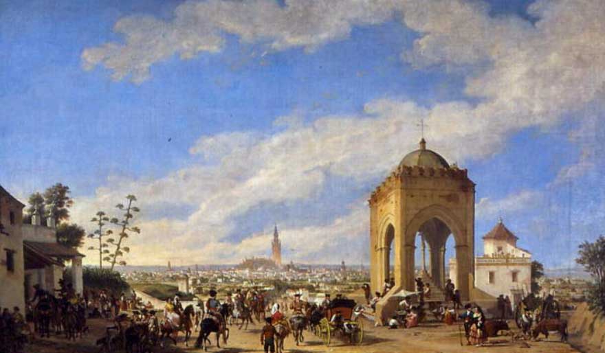 26 de Julio de 2015 El pintor Joaquín Domínguez Bécquer, nace en Sevilla, en 1817. Formado en la Escuela de Bellas Artes de Sevilla, fue encargado por la corte de Isabel II de las labores de dirección de los trabajos pictóricos realizados con ocasión de la restauración de los Reales Alcázares de Sevilla, lo que le valió ser nombrado pintor honorario de cámara y maestro de dibujo de los sobrinos de la reina. Máximo representante de la pintura costumbrista sevillana entre su producción pictórica destacan sus obras con tema sevillano como : La Plaza de la Maestranza de Sevilla, la Vista de Sevilla desde la Cruz del Campo y La Feria de Sevilla. También realizó retratos y obras con temática histórica pero de mucho menos nivel artístico. Su obra se encuentra representada en el Museo de Bellas Artes de Sevilla. Era primo del también pintor costumbrista José Domínguez Bécquer y, por lo tanto tío de sus hijos, el poeta Gustavo Adolfo Bécquer y del también pintor Valeriano Domínguez Bécquer.- Murió en Sevilla tal dia como hoy un 26 de Julio de 1879 .-