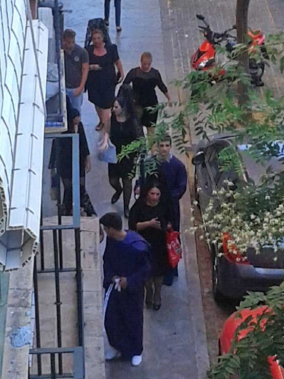 6 de Julio de 2015 Un buen amigo me remite estas fotos tomadas desde su domicilio del barrio de San Bernardo de Sevilla el pasado jueves 2 de Julio, con el siguiente comentario: ¿ Estamos en Jueves Santo en pleno mes de Julio en Sevilla ? .- Tras despertarse de una placentera siesta, se asomó al balcón de su casa, sufriendo como un mareo temporal al ver la calle llena de señoras y señoritas de mantilla, asi como jovenes vestidos de nazareno con una túnica que desconocía a pesar de ser muy capillita, una túnica morada de cola con cingulo blanco y ¿ alpargatas blancas? . Por un momento llegó a pensar que sus siesta se había prolongado mas de la cuenta , y que se habia despertado en un mas que calurosa Semana Santa sevillana .-