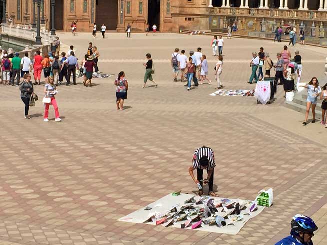 Toda esta venta variopintos y multicolores cachibaches made in china de abanicos, castañuelas, y demás souvenir, los podrian regularizar y desplazar a otras zonas del parque y no precisamente dentro de un museo cerámico al aire libre como nuestra Plaza de España , algo que sería impensable en otros monumentos europeos, o poner una cartel en cada una de sus torres donse pueda leer una obviedad : " Prohibida la venta ambulante en todo este monumental recinto" .- Esto no es La Sevilla que no vemos, es desgraciadamente La Sevilla que SI vemos , esto que ven en las fotos puede competir con el mercadillo del Parque Alcosa o del Charco la Pava .- |