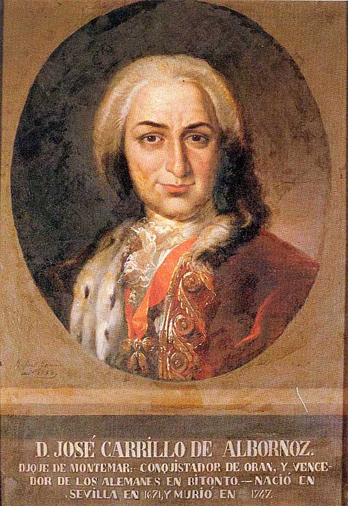26 de Junio de 2015 El señor del cuadro es José Carrillo de Albornoz y Montiel Delgado, I duque de Montemar, Grande de .España . III conde de Montemar nació en Sevilla, el 8 de octubre de 1671. Tuvo una mas que dilatada y existosa vida militar como reza en el cuadro fue conquistador de Orán y vencedor en BItonto .- Efectivamente fue general en jefe del Ejército que reconquistó Orán en 1732. Su escuadra salió de Alicante, , con un transporte de 600 navios y división de galeras conduciendo 26.000 hombres, con 110 cañones y 60 morteros. Después de una diversión se desembarca en las proximidades de Orán con 500 lanchas cargadas de granaderos, en un impresionante desembarco anfibio en el siglo XVIII ( el desembarco de Normandia fue mucho después ) que fueron hostigados por 2.000 jinetes moros.- Una vez desembarcados todos los hombres comenzaron a tomar posiciones, como la de Monte Santo, lo que atemorizó a los defensores de Orán, que la abandonaron, y así fue tomada por los españoles con sus 5 fortines, 138 cañones y 7 morteros y abundante munición intactos. En el puerto (Mazalquivir) se capturaron una goleta y 5 bergantines corsarios. Una vez tomada y asegurada la plaza, se dejó con 8.000 infantes y un regimiento de caballería . La ciudad se mantendría bajo control español hasta 1792 .- Montemar fue recibido con gran expectación en su propia tierra en Sevilla el 15 de agosto. Felipe V le concedió el collar de la Orden del Toisón de Oro en reconocimiento a los servicios prestados a su país ( Recordemos en este punto que Sevilla fue Villa y Corte durante 5 años bajo el reinado del mencionado Felipe V ) Años despues , participó en la Batalla de Bitonto el 25 de mayo de 1734, donde arrebató a los austriacos las plazas de Nápoles y Sicilia, que habían pertenecido a la Corona de España hasta 1700, en provecho de los Borbones. En agradecimiento a los servicios prestados en esta batalla, Felipe V elevó en 1735 el condado de Montemar a ducado, añadiéndole la Grandeza de España, por Real Cédula de 20 de mayo de dicho año. Posteriormente sirvió como Ministro de Guerra desde 1737 a 1741, falleciendo en Madrid, tal dia como hoy el 26 de junio de 1747.- |