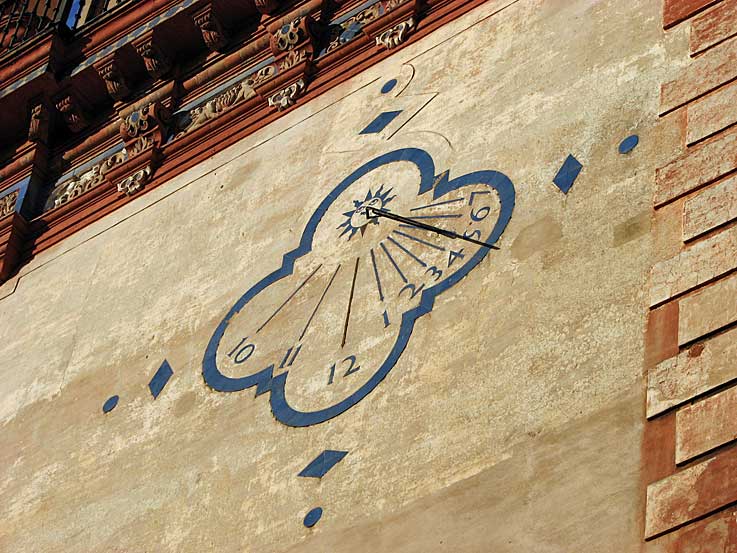 Con el número 1 , tenemos un bello atento a los multicolores de la fachada y una buena pista tiene un reloj gemelo al lado . Son dos relojes de Sol juntos .-