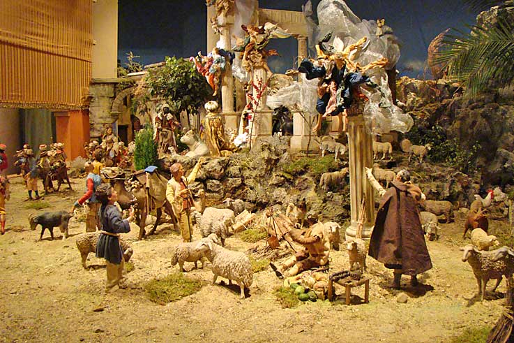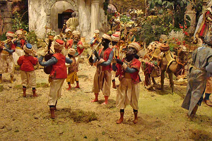 Bajo una ornamentación plateresca, destacan algunas escenas, como el pesebre coronado por una corte de ángeles de gran hermosura, el Cortejo de los Reyes Magos, la banda de músicos turcos que acompaña a sus Majestades los Reyes Magos y la Anunciación de los Pastores. En cuanto a las figuras, la colección de esculturas, propiedad de la Fundación Cajasol en su mayoría, la conforman piezas de 35 centímetros de altura.-