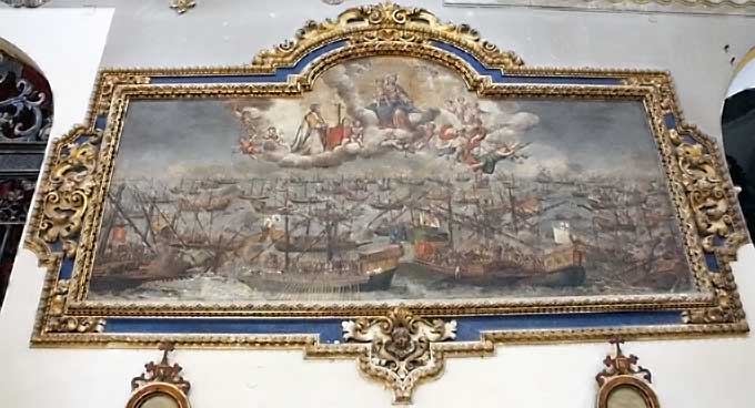 Inconmensurable obra nuestro paisano Lucas Valdés, situada muy alto en el muro de la Epístola de la Iglesia de la Magdalena , representa La Batalla de Lepanto, |