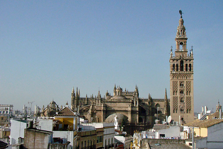 En la foto superior tiene una panorámica de la calle Mateos Gago , así como de la Catedral y la Giralda de Sevilla .-