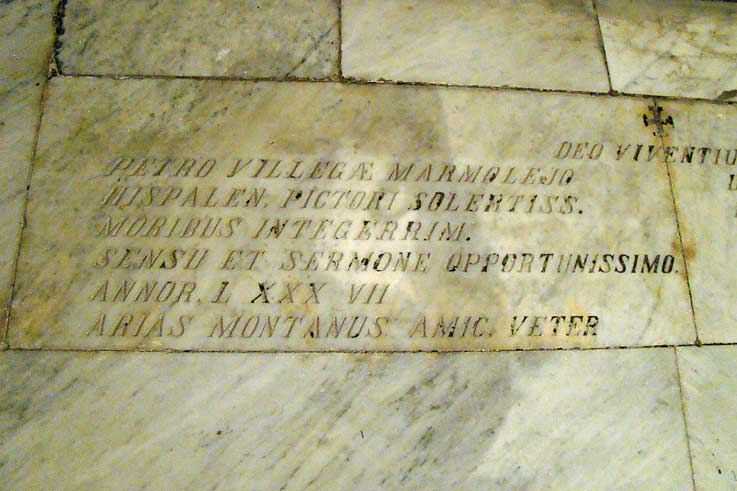 AL DIOS DE LOS VIVIENTES. PEDRO VILLEGAS MARMOLEJO PINTOR SEVILLANO DE GRAN INGENIO Y SANAS COSTUMBRES DE CONOCIMIENTO Y DISCURSO MUY APROPIADO VIAJO A LA PAZ A SUS 87 AÑOS Y SU VIEJO AMIGO ARIAS MONTANO SEGÚN LO PROMETIDO EN SU TESTAMENTO HIZO QUE EL ARQUITECTO M.PEREZ ESTO GRABARA EN HONOR DE SU AMISTAD AÑO DE NUESTRO SEÑOR DE 1597 .