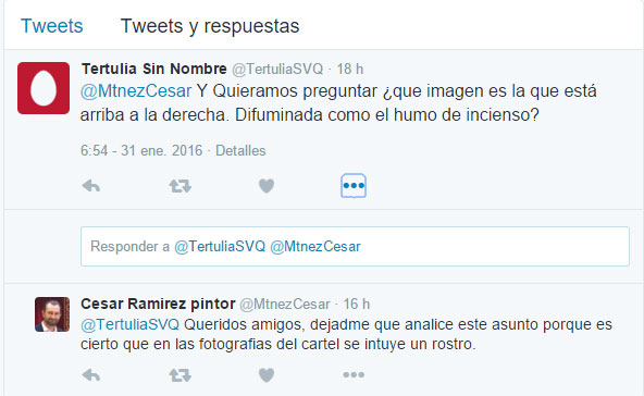 1 de Febrero de 2016 Advertencia: Ninguna de las fotos que aqui aparecen se ha usado el "adobo fotochóp", salvo para marcar las zonas en la mismas . Ayer publique mi crónica sobre el cartel de la Semana Santa del Consejo de HH y CC de Sevilla 2016 , con el título UN CARTEL DE CUARESMA , en el comentaba : "en la esquina superior derecha se forma con el humo del incienso, una especie de pareidolia donde aparece el rostro de un Cristo" .- Yo creía que era solo una apreciacion personal de un servidor , pero en el Twitter me encuentro con esto, donde el propio autor del cartel reconocía que se intuía un rostro
