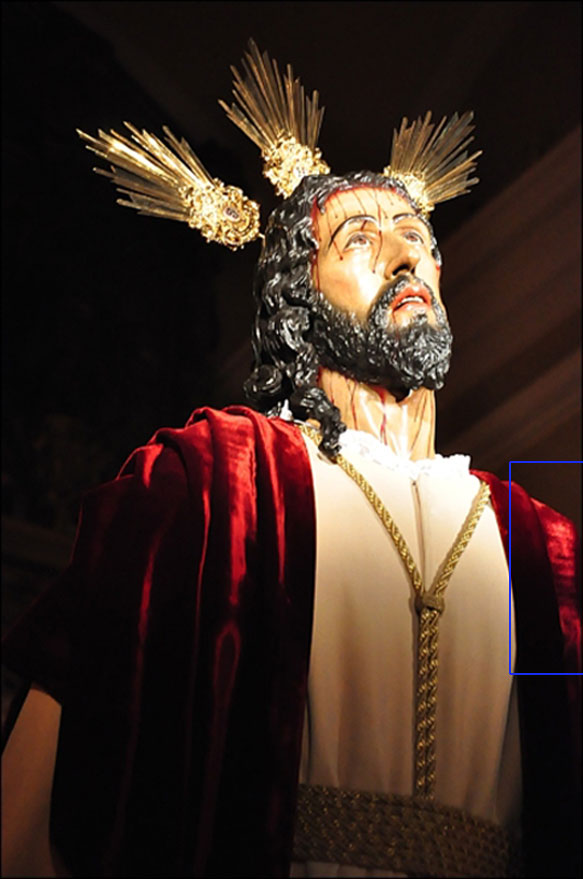Puesto que al parecer no se trata de ninguna intencionalidad del pintor, que ha querido dejar difuminada el rostro de un Cristo, no es que vayamos a entrar en el terreno de los paranormal, sino mas bien estamos en presencia de una pareidolia .- Para los que no lo sepan, una pareidolia es un fenómeno psicológico donde un estímulo vago y aleatorio (habitualmente una imagen) es percibido erróneamente como una forma reconocible, es decir nuestro cerebro da una forma reconocible a algo que originariamente no lo tiene , como si resolviera mentalmente un puzzle imaginario .- Esto me trae a la memoria lo que ocurrió en el Besamanos de Jesus Despojado del 2012 , donde en sus ropajes, según el angulo de visión de la camara se podia ver en su hombro derecho un rostro de un hombre negro ¿ encuadre, luz, reflejos ?, pero el caso es que se vieron en las fotos de muchos fotografos habituales a estos cultos .-