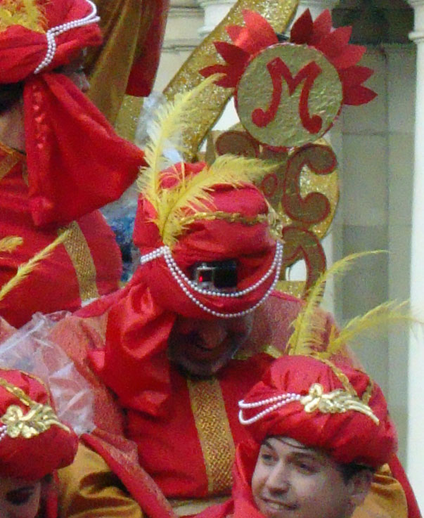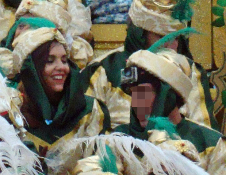 Por último, en estas dos fotos de la carroza del rey Melchos y Gaspar respectivamente , vemos que en su cortejo algunos de sus acompañantes llevaban en el turbante colocado estas cámaras que estan de moda de acción-deportivas, ( como las que llevan los marines de los Estados Unidos de América, en sus acciones de combate ) , para gravar la Cabalgata desde un plano subjetivo y desde un enclave enviadiable.- |
